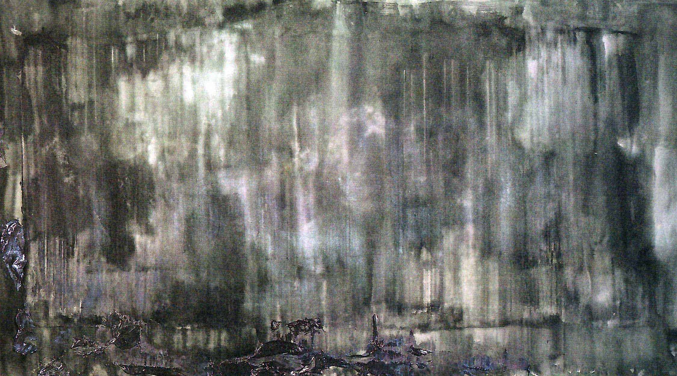 In his piece, Monsoon, 1988, Keller swept the tinted gel across the mottled stain grounds, leaving a thin coat, like a film, across the surface. At the end of the “sweep”, the left over paint materials pile up in thick blobs along the left and bottom edges.