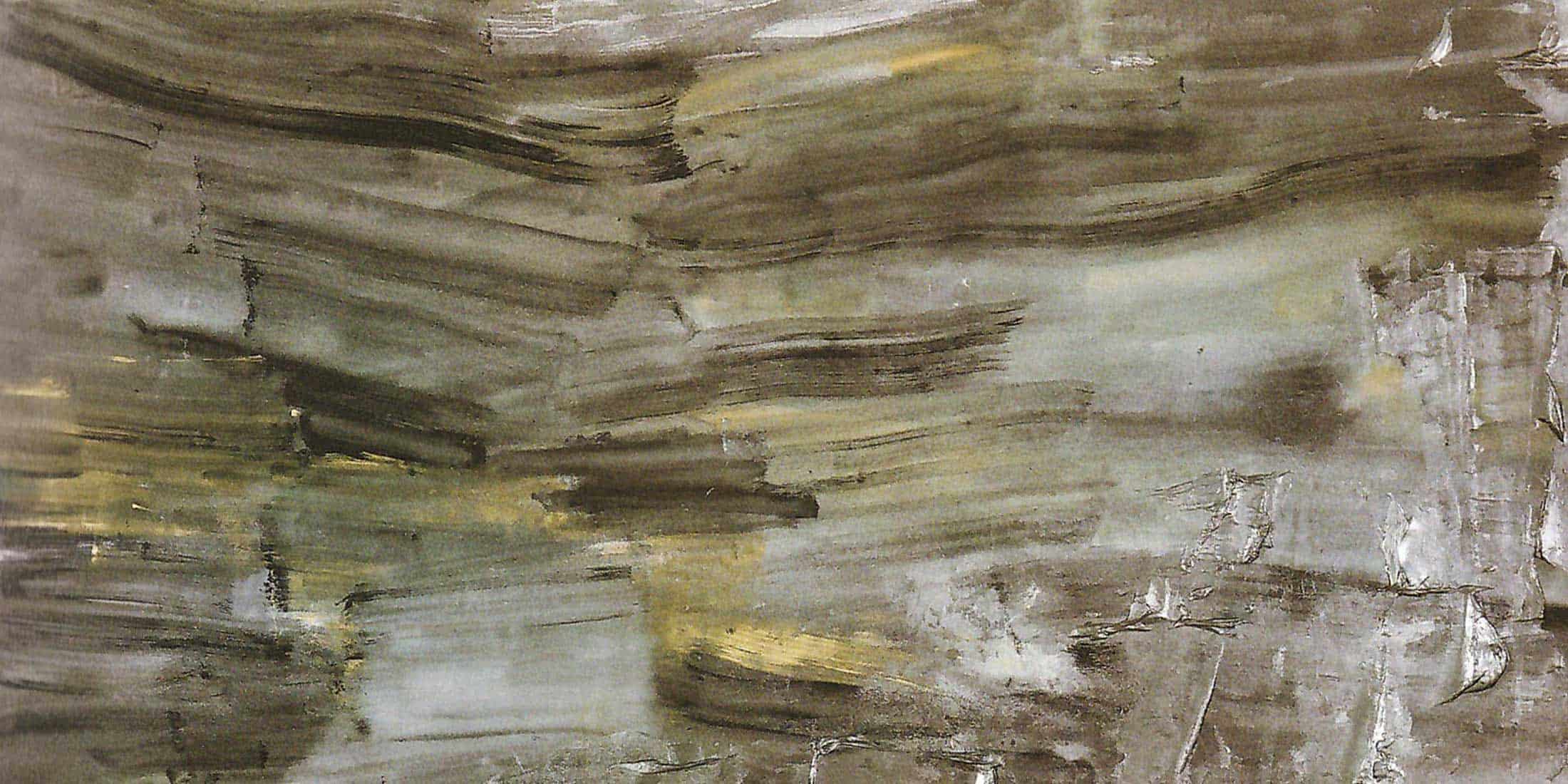 In this lovely gold-grey painting, the colour slowly emerges, like a reluctant after-image with the effect that the picture seems to glow with an ambiguous light.